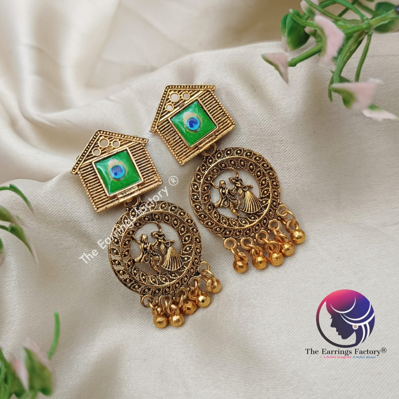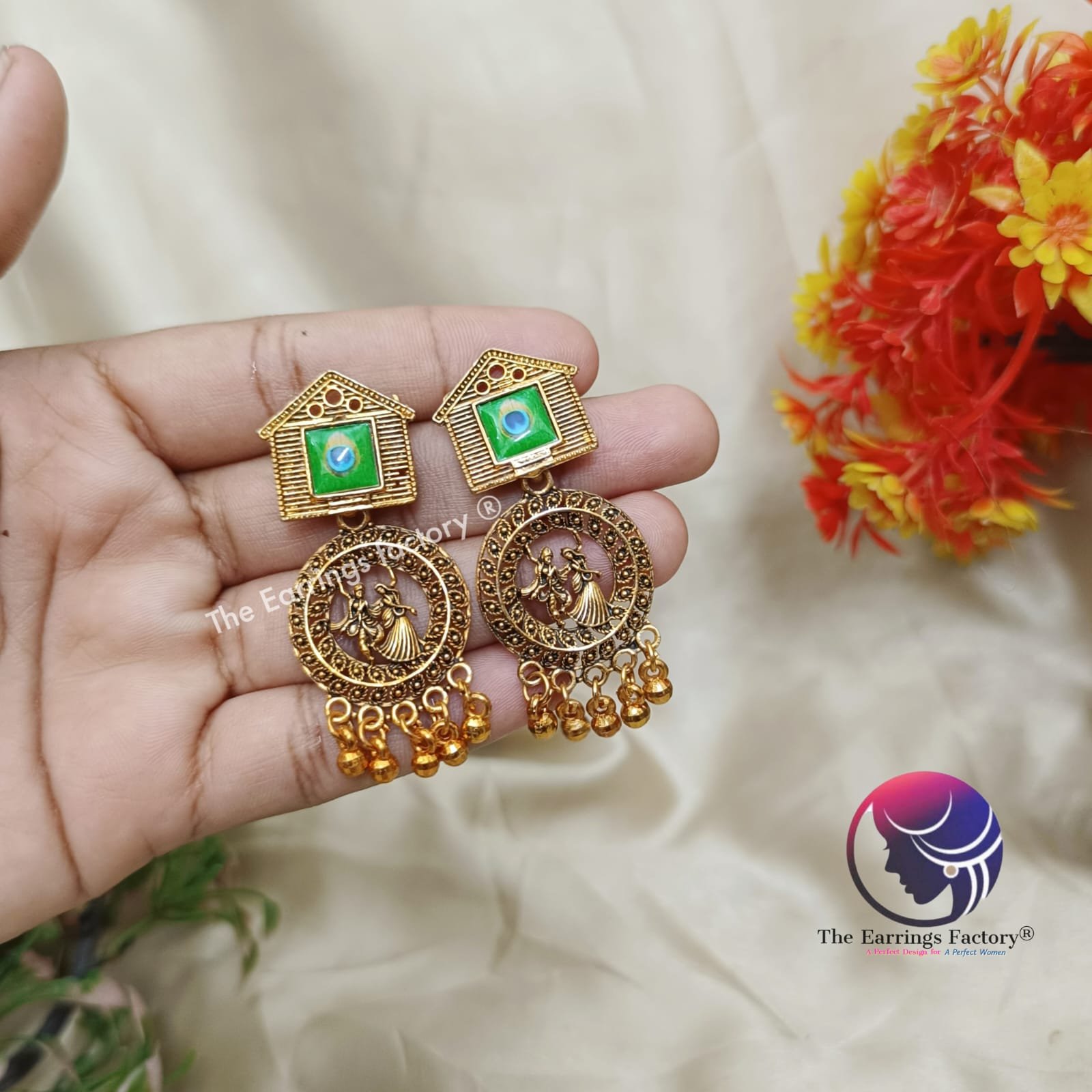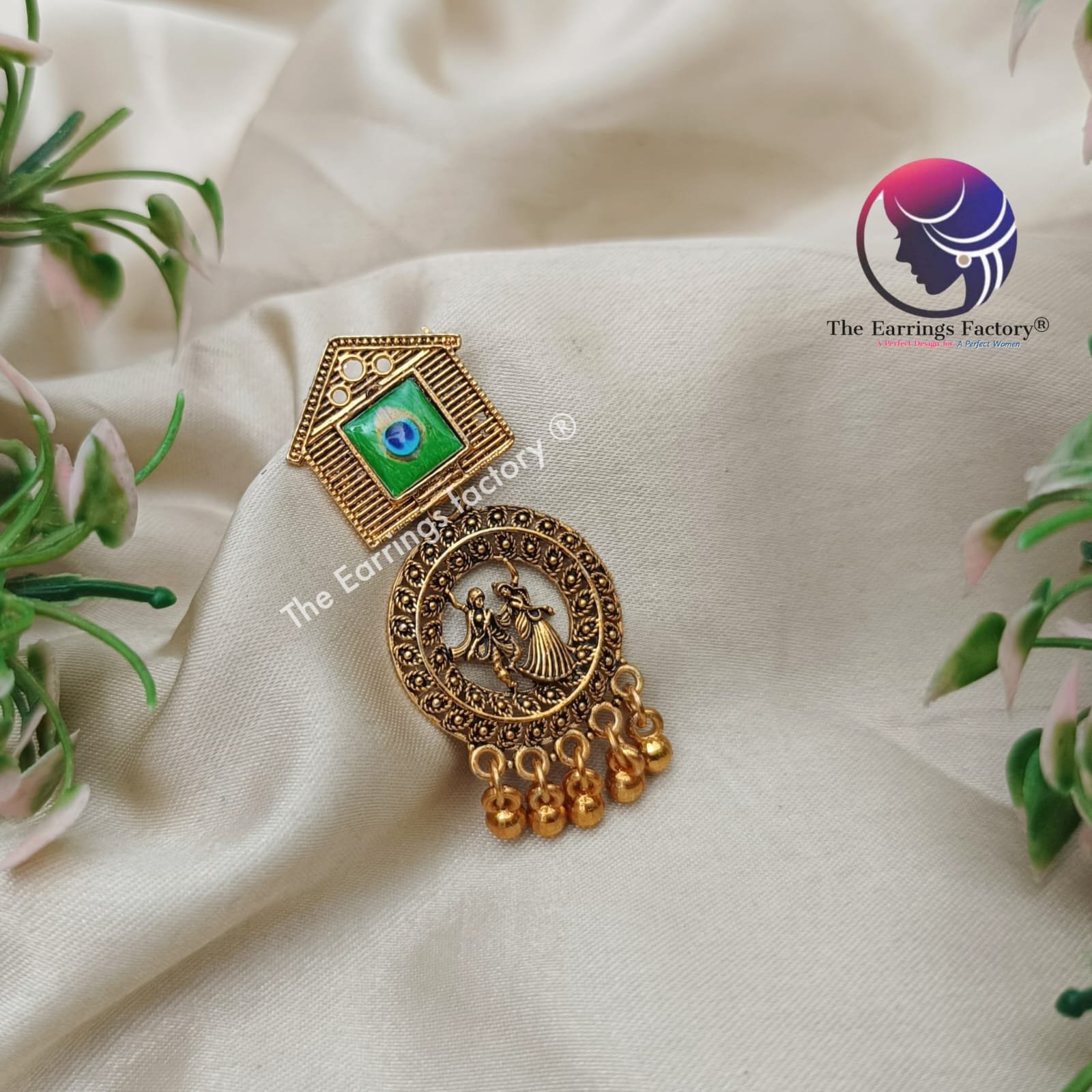 Traditional Radha Krishna Golden Peacock Feather Earrings