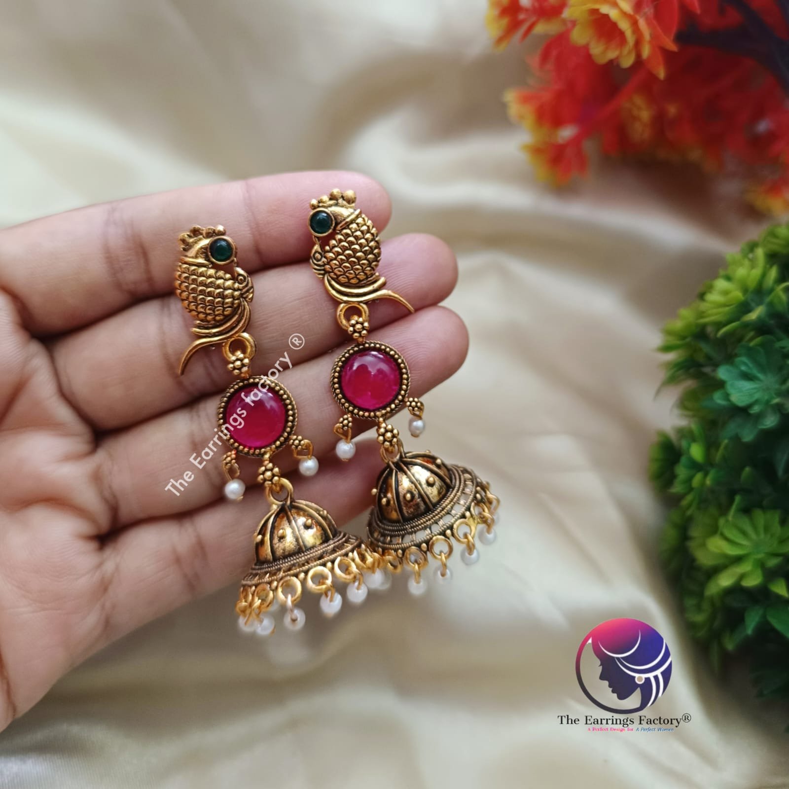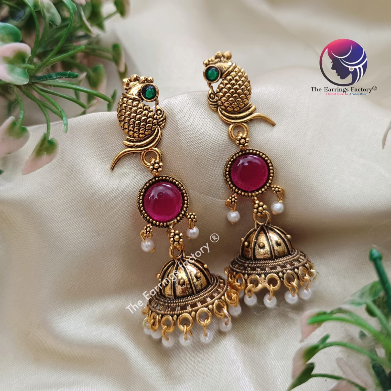 Traditional Weightless white Beads Golden Peacock long Multi stone Jhumka