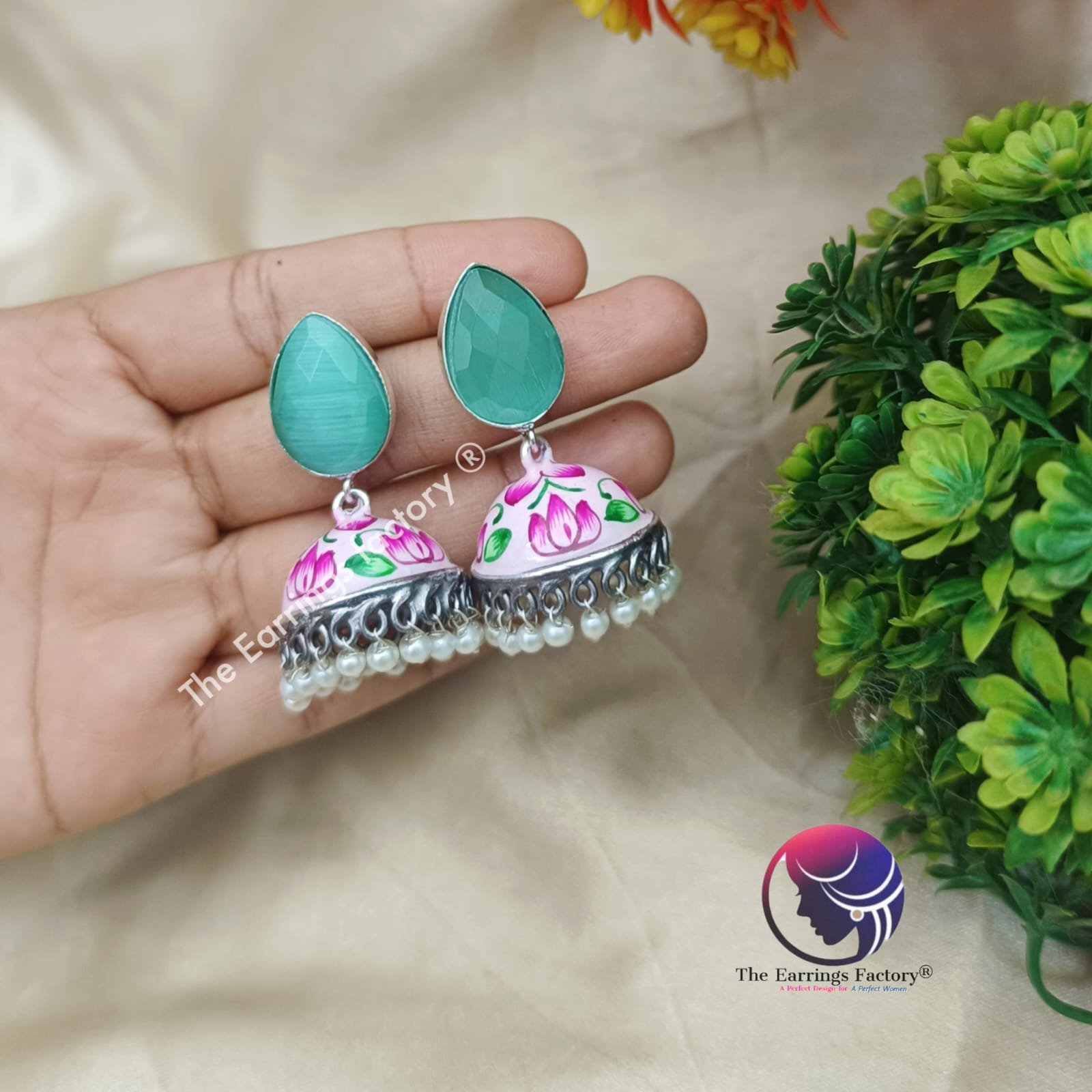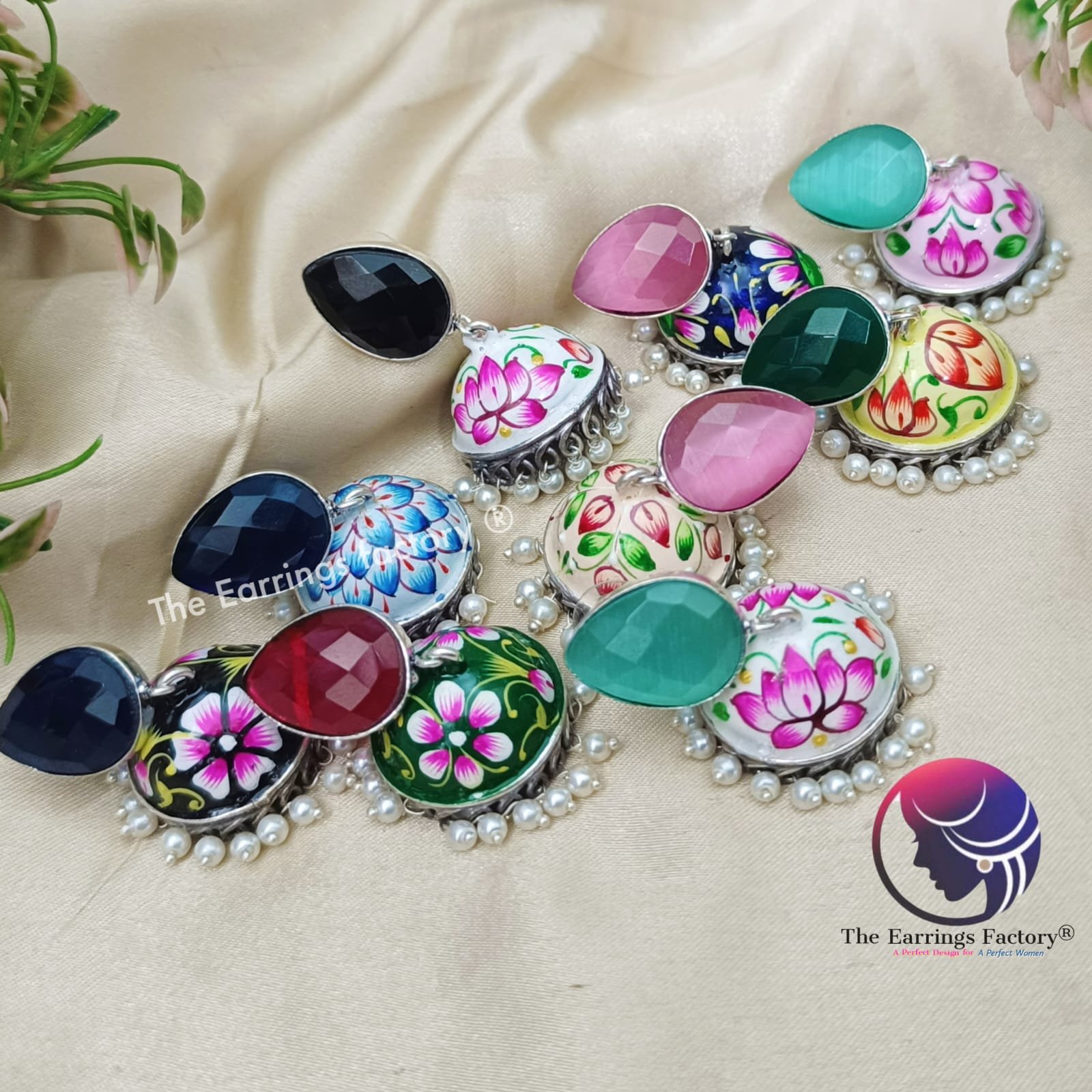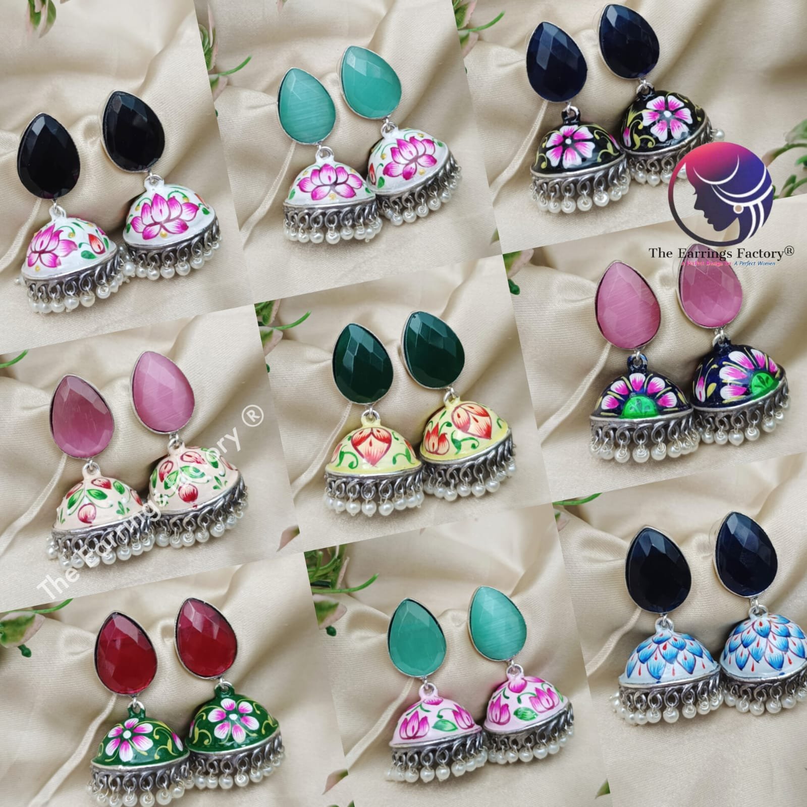 Trending Oxidized Silver Hand Painted Meenakari Crystal Stone Jhumka